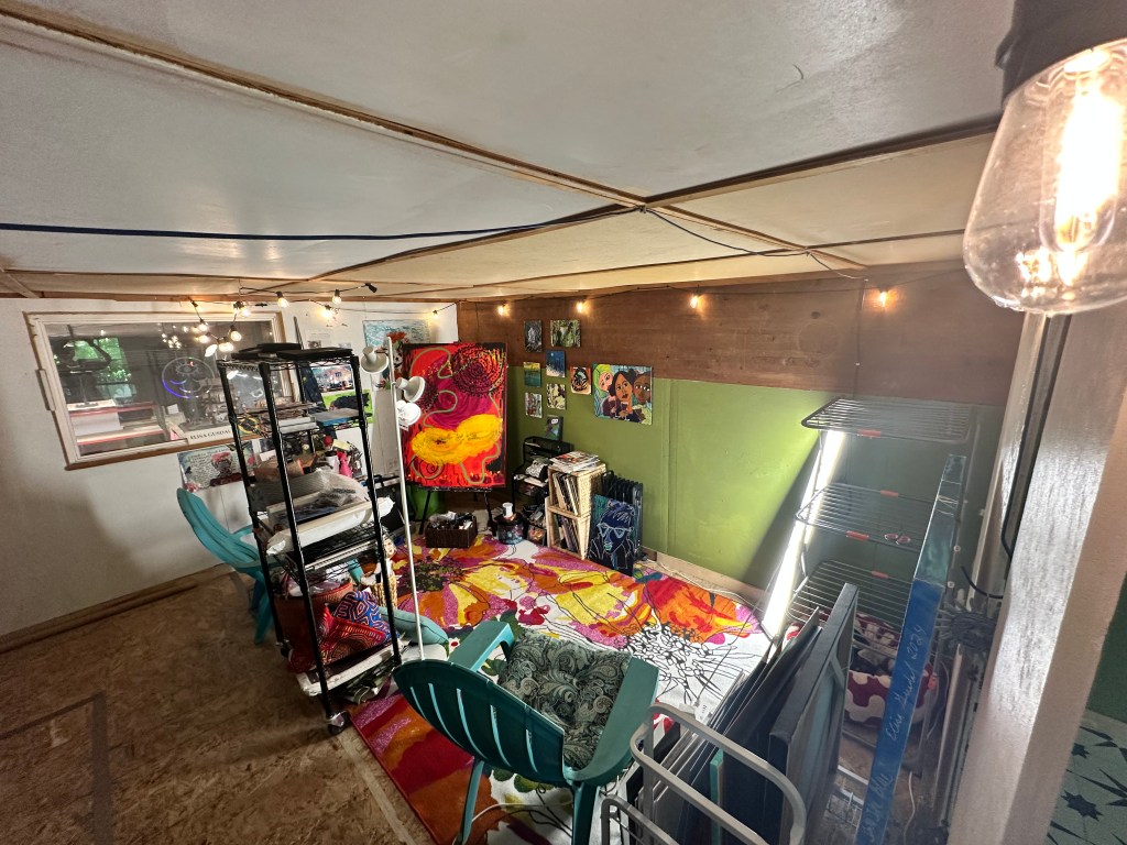 I hadn’t been a roomate in over 30 years so moving in with a colleague from my theater side gig was a leap of faith too. Hopefully she enjoys the company as much as I do. I live in the upstairs of my friend’s house which technically is the attic. There are two finished rooms up there and a doorway that leads to the rest of the attic. The rent is kindly priced unlike anything else in Portland, allowing me to save up for that condo or loft where my studio is in my living space. And because there are two rooms I have had a studio in the second room which works out. And I’m still living tiny. I haven’t actually measured but I’d guess the space to still be around 200 feet. Although I do share a shelf in the fridge in the kitchen and the bathroom downstairs. I have a huge redwood right outside of my window and incredible backyard garden that takes me back to the rivers and creeks I have been living on. Once in awhile Dudley and I drive back to our old stomping grounds and “smell the Redwoods”.