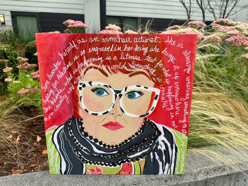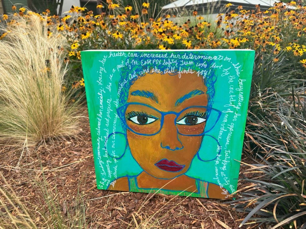 If you choose to give a donation to help me capture my goal of 100 portraits for my exhibit, a donation of $100 or more will allow me to paint another person who inspires me in their activism. At that amount, your portrait will be yours at the end of my year of shows. (a painting that normally would cost you $600, as I currently get $2.50 a square in for my work.)