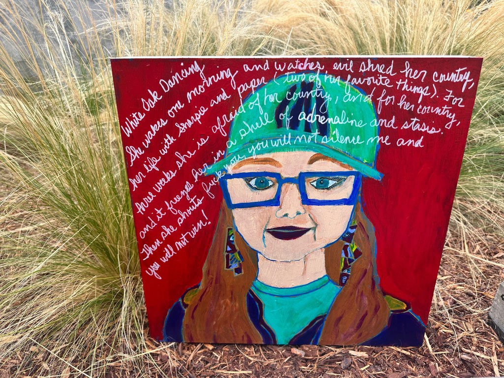 At the same time, there were so many people I was meeting doing so much good work. I decided I wanted to focus on and document these folks. So…. I started a second art project that I’m calling “We The People, Tiny Stories of Resistance”. I am painting small portraits and telling the stories of the ordinary people I am meeting along the way doing tiny acts of resistance. My hope is to paint 100 portraits that I will be showing in shows in very public places for the next year. I want folks to see it and realize they are not alone. I want them to realize there are a multitude of ways to get involved in resistance. Parents can partner with other parents, sharing child care duties freeing each other up to participate in the protests and local Indivisible Group actions. Folks can petition Lawmakers. They can donate to the ACLU or other organizations doing good work. They can make art. They can simply speak up and say what is happening is wrong. My second hope is that by having my art shown in major arts organizations and businesses around town I will be putting pressure on those pillars to have the guts to show my art even when they get push back from their patrons, who may see no problem with what is happening. My hope is my art will connect people, not just with the community but also in honoring our ancestors by doing something, learning from what worked in the past and using those tools. Its not about us individually but rather the story we all weave, those here now and those who came before.